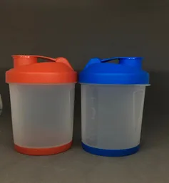 A portable container designed for mixing protein powders, supplements, or beverages. It typically features a secure lid, a built-in mixing mechanism (such as a whisk ball), and sometimes measurement markings for easy preparation of drinks.